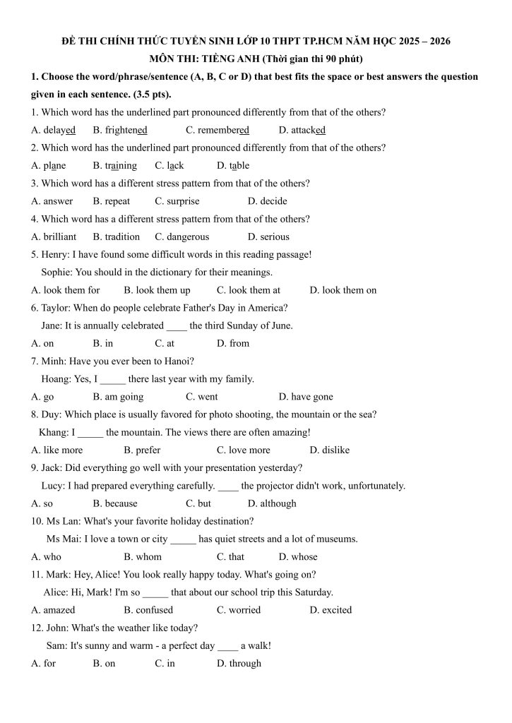 File Word Đề Thi và Đáp Án Tuyển Sinh Lớp 10 TP.HCM Năm Học 2025 – 2026 Môn Tiếng Anh